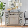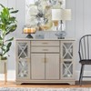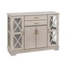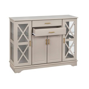 Update your living space with the Kendall Buffet from Buylateral. Ideal for your dining room, this cabinet features unique panel tempered glass doors with an x-shaped overlay and adjustable tempered glass shelving. The concealed closed center cabinet and two drawers provide added space for storing tableware, linens and more. Designed with a gray finish and a transitional style, this cabinet is the perfect complement with most dining room décor.