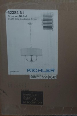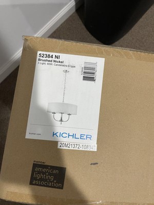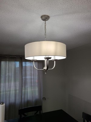 [This review was collected as part of a promotion.] I received the Kichler Kennewick 3 Light Chandelier with White Fabric Brushed Nickel and looks amazing. I replaced the stand light above our small kitchen table with this and it really stands out. It looks great. It’s great with LED bulbs. The fit, finish, quality of this chandelier is great. It really does make my kitchen look much better. I highly recommend it.