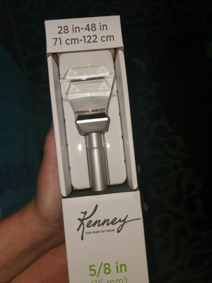 Add a touch of style to your home with the Walton 5/8" Standard Decorative Window Curtain Rod by Kenney. The 5/8 inch diameter Walton curtain rod in brushed nickel features matching crystal shaped finial ends. Use in your kitchen, bedroom, dining room, and living room to hang light to medium weight curtains. The telescoping rod adjusts from 28 to 48 inches, 48 to 86 inches, or 90 to 130 inches to fit your window and projects 3 inches from the wall. It is ideal for hanging curtains with pockets, grommets, back tabs, and tab tops, but can also be used with clip rings. Drapery Hardware Set Includes: one telescoping steel curtain rod with decorative acrylic finials (2.57" L x 1.90" W x 1.90" H), mounting brackets, screws, drywall anchors, and installation instructions.