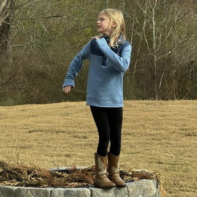 These boots are so cute! They fit well and true to size. She wears them with pants, dresses or whatever and they’re still cute. They have held up well and durable material.