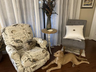 Beautiful, comfortable this is the just right chair for MaMa bear! The bird print is very relaxing to look at and the easy to engage reclining aspect makes it the perfect addition to my living room.