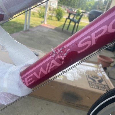 Bike arrived in a damaged shipping box with another stores label on it. Bike it self had damage to the frame and lettering.
