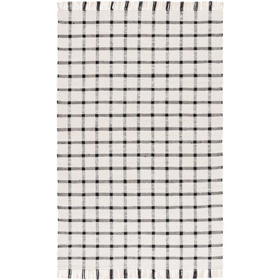 Crafted in the rich textile heritage of India, the rug boasts an elegant ivory base artistically intersected by bold black linear accents, invoking a sense of order and modern sophistication. The chic pattern is versatile and seamlessly accents any room, whether it's adding a refined touch to your home office or serving as a cozy centrepiece in your living room.