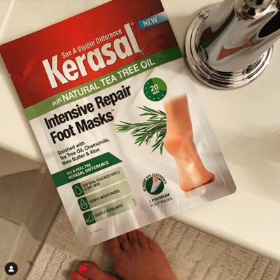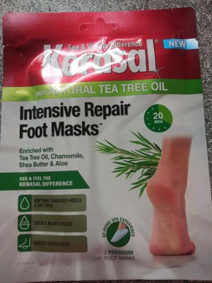 Kerasal Intensive Repair Foot Masks do leave your feet feeling much softer. They are enriched with tea tree oil, chamomile, shea butter and aloe. They have a very nice smell to them, not too strong, just right. They are easy to put on and I think they stay in place much better with regular socks overtop of them. You leave them on for only 20 minutes and then take them off and do not rinse. These are not to be mistaken for the foot peels - these will not make your skin come off - they just moisturize. I would use them again and I would recommend.