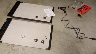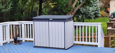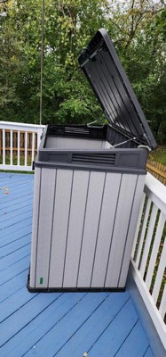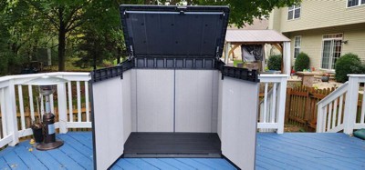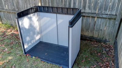 [This review was collected as part of a promotion.] Husband was very excited to see this as he was trying to clean up the yard before Halloween. I helped him open the box and the instructions looked very straight forward. He put it together fairly easily, only complaining a couple of times that the holes for screws were not lining up correctly (which could easily have been user error, I've seen him assemble things before). IT is a very sturdy little box, easily opens and closes from all sides and we can store all of the patio accessories and kids toys in it, out of sight when not in use. I believe we may order a second, so we can use it for the trash cans. Love it!