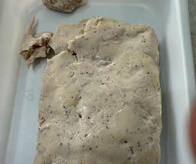 I should’ve looked at the reviews. Look at the chicken. This looks terrifying. Is this white…. White paste?