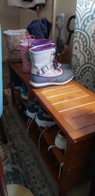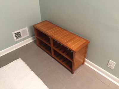 Organize your shoes in your closet, bedroom or entryway with the Keystone Shoe Bench. Shoe bench can store about 8 pairs of shoes. For closets, use the top seat as an extra shelf to stack clothes or extra shoes. Top dimension 38.4"W x 11.8"D, and Seat height is 18.27". Bottom two slated shelves have four sections with each dimension about 17.1"W x 11"D x 7.2"H. Made of combination of solid and composite wood in teak finish. Weight capacity is 200 lbs. Assembly required.