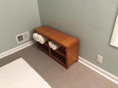 This bench is perfect in my bathroom; I’m using it to hold towels. While I appreciate the aesthetic of it, I do think it’s a little pricey. I was expecting more heft but I understand the type of wood is just more lightweight. My 10 yr old built it so it’s easy to assemble with a power drill. It feels structurally sturdy but I’m also a little afraid to sit on it because the wood is thinner than I expected. I will be keeping it because I’m too lazy to return it and it took me a while to find a bench I liked.