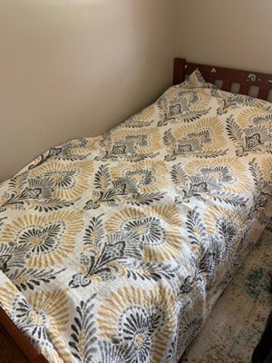 The Kiana Reversible Quilt Set by Levtex Home is inspired by large scaled vintage Continental wallpapers. This damask medallion design will immediately transform your bedroom. Made with the softest lightweight cotton, this reversible quilt features a large scaled medallions in gold, charcoal and grey on a cream ground, reversing to a ditsy grey medallion on the other. The Twin Quilt Set is machine washable and includes the quilt and standard pillow shams. Enjoy this for years to come!