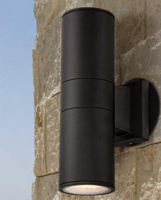 This Wall Cylinder features a unique two light design that shoots light both up and down your walls. It uses BR-30 bulbs which produce 65-watts (max.) of pure light. It measures 12in. high and is U.L. listed for damp location. Back Plate Height: 4.50 Back Plate Width: 4.88 Material: Aluminum, Finish Color: Black, Width: 4.75", Height: 12", Depth: 7", Height From Outlet Box: 4.88", Backplate Width: 4.88", Backplate Length: 4.5", Lamping Type: Incandescent, Number Of Bulbs: 2, Wattage: 65 Watts, Dimmable: No, Moisture Rating: Damp Rated