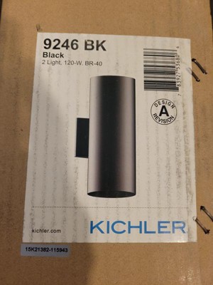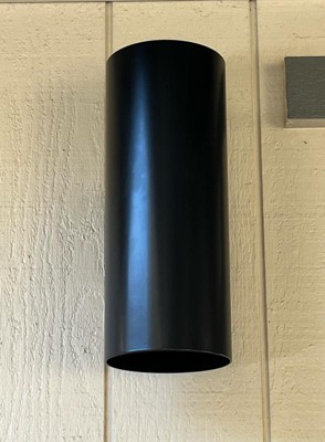 This Wall Cylinder features a unique two light design that shoots light both up and down your walls. It uses BR-40 bulbs which produce 120-watts (max.) of pure light. It measures 15in. high and is U.L. listed for damp location. Back Plate Height: 4.50 Back Plate Width: 4.88 Material: Aluminum, Finish Color: Black, Width: 5.75", Height: 15", Depth: 8.5", Height From Outlet Box: 4.88", Backplate Width: 4.88", Backplate Length: 4.5", Lamping Type: Incandescent, Number Of Bulbs: 2, Wattage: 120 Watts, Dimmable: No, Moisture Rating: Damp Rated