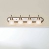 The modern lines of this 30in. 4-light bath light fixture in a Chrome finish with Satin Etched glass will blend into many decors. Mounting Direction: Up or Down Back Plate Height: 4.75 Back Plate Width: 30.00 Material: Steel, Finish Color: Brushed Nickel, Width: 30", Height: 8", Depth: 8", Height From Outlet Box: 3.5", Backplate Width: 30", Backplate Length: 4.75", Lamping Type: Incandescent, Number Of Bulbs: 4, Wattage: 100 Watts, Dimmable: No, Moisture Rating: Damp Rated