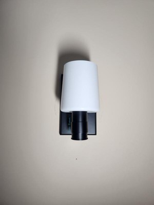 Collection: Adani, Material: Steel, Finish Color: Black, Width: 5", Height: 8.5", Depth: 6.5", Height From Outlet Box: 4.25", Backplate Width: 8.5", Backplate Length: 5", Lamping Type: Incandescent, Number Of Bulbs: 1, Wattage: 60 Watts, Moisture Rating: Damp Rated, Desc: The striking silhouette of the Adani wall sconce light makes a sophisticated statement. Its opal glass beautifully illuminates in modern style. In black, it�s the perfect accent lighting.,