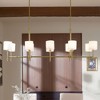 [This review was collected as part of a promotion.] This linear chandelier is a 10 lamp shaded model that is a great choice for style and functionality. This model is brushed natural brass, the finish is consistent on all components, matching perfectly and exhibiting a high quality. The fabric shades are white, light weight and secured by the 40w LED candelabra bulbs. The unit installation height is variable to accommodate different height ceilings (this installation is on a 9' ceiling using one 12" extension stem), included in the installation kit are 4x12" and 4x6" extension stems. Shipment and Packaging: As the main component is pre-assembled, the carton is 5 feet in length and approximately 20 lbs. As the photo illustrates, care is evident in the wrapping of components in plastic to prevent scratches to the finish, individual boxing of the shades to protect shape and sturdy molded foam securing all component for shipping. Installation: After confirming all component were included, review of the instructions (in multiple languages) was quick and clear in the overall assembly process and detail on installation steps. First step is assembly of the units stems for the appropriate ceiling height with attachment to the finished canopy to prepare for hanging and electrical connection. This was a quick and tidy process. Next step is the installation of a mounting plate that is attached to the ceiling box first that has a trapeze type of cabling system to allow a quick attachment of the completed main unit to support for the electrical connection. The final step is the connection of the main unit via the finished canopy to the mounting plate. Cabling and wires are contained in the canopy which secures with two finished lug nuts. Overall Lighting Effect The 10 40w LED bulbs provide great ambient lighting in a large space in this case our kitchen. A very pleasant glow is the result. Project Time: From start to finish (removal of existing fixture, installation of this unit), the project time was two hours. A second set of hands is very helpful for attached the main unit to the mounting plate and final assembly of the finished canopy to the mounting plate to simply lift up and stabilize the unit.