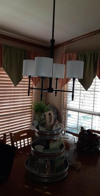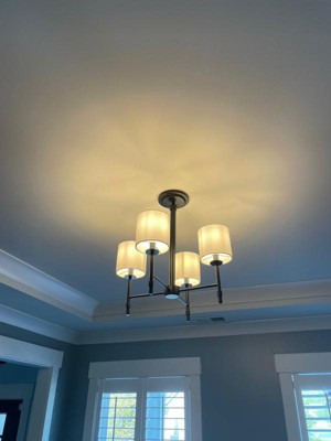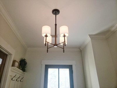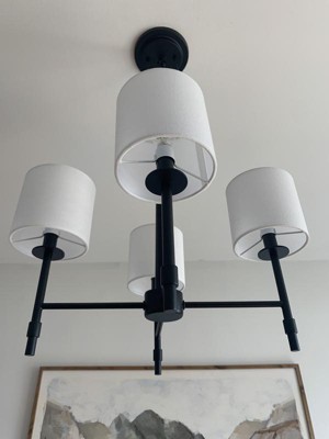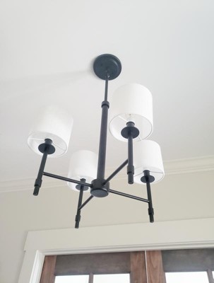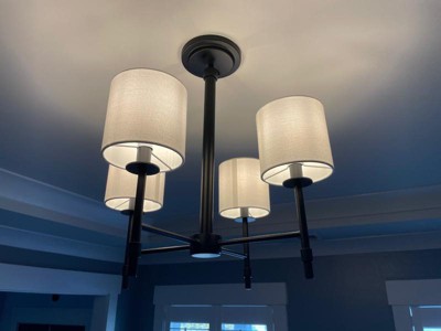 [This review was collected as part of a promotion.] The Ali 20" 4 Light Chandelier in Black is a refreshing modern take on a chandler. The installation was simple and the instructions were well written. The light has bright white cloth shades that really pop when using LED bulbs. There are options to install the light fixed to the top plate or extended it to allow for a lower chandelier. The metal has strong feel and all the parts fit well together. Over all this light is well made and has options for hanging height to bring great light in to any room.
