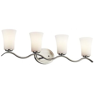 I absolutely love the design of the Armida 4 light vanity light in brushed nickel. The curves gives it a bit of whimsy as apposed to just being a straight line. The brushed nickel matched all of my other fixtures perfectly. I also like that you can either install it with the glass diffusers facing up or facing down, it is always nice to have a choice, I chose facing down. This fixture provides plenty of light to our bathroom. It was extremely easy to install. I highly recommend to anyone looking for a great quality light fixture. .