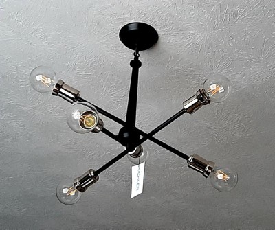 This Mid-Century 6-light chandelier in Black from the Armstrong collection features a in.sputnikin. design with adjustable arms allowing you to customize the light for just the right look. Sloped Ceiling Adaptable: Yes Chain Length: 36.00 Material: Steel, Finish Color: Black, Width: 20", Height: 27.75", Chain Length: 36", Lamping Type: Incandescent, Number Of Bulbs: 6, Wattage: 100 Watts, Dimmable: No, Moisture Rating: Dry Rated