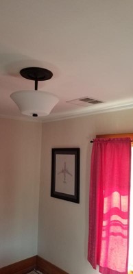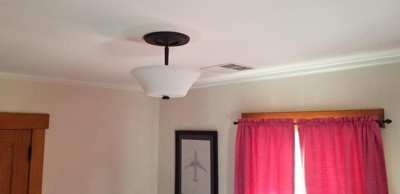 [This review was collected as part of a promotion.] This gorgeous three-bulb fixture was just what I was looking for to update a bedroom in my transitional-style home built in 1916. This fixture provides the clean, classical style I was looking for and it nicely complements the room decor and styling. The fixture is made of quality material and the glass shade is heavy with a coating that provides a wonderful, warm glow to the room The installation instructions were clear and simple to follow. The fixture base that attaches to the ceiling is about 5.5 inches in diameter. Before installing, be sure to determine if you need a trim medallion go around the base to fully cover the ceiling hole. This fixture is a great addition to my home!