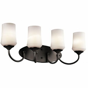 You'll love the transitional styling of this 4 light bath light from the Aubrey(TM) Collection. The unique satin etched cased opal glass shape and Brushed Nickel finish are the perfect blend of styles creating the perfect complement to your home. Mounting Direction: Up or Down Material: Steel, Finish Color: Olde Bronze, Width: 29", Height: 10.75", Depth: 6.5", Height From Outlet Box: 7.5", Lamping Type: Incandescent, Number Of Bulbs: 4, Wattage: 100 Watts, Moisture Rating: Damp Rated