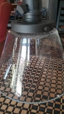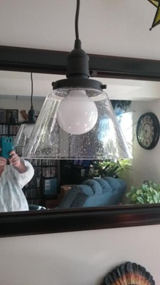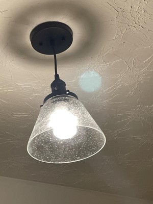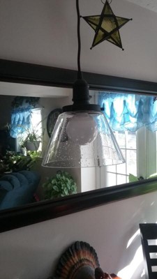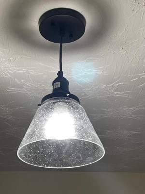 [This review was collected as part of a promotion.] This is a great smaller pendant light. It was easy to install and puts off a good amount of light. The glass has great seeded detail and there is a neat switch detail. Great color, current style and affordable.