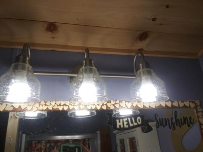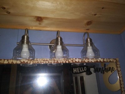 [This review was collected as part of a promotion.] Recently, we decided to remodel our bathroom and I began to look for a vanity light. When I saw the clear seeded glass shades of the Avery vanity light in brushed nickel, I knew I found what I was looking for. I also liked that the back plate was just a small circular base. The vanity base and arms are made from steel making it sturdy. But it’s also lightweight weighing under 5 ½ lbs. so it was easy for one person to put it up. It is only 24 inches wide and the 3 glass shades which is perfect for a single sink vanity. The seeded glass shades give off good lighting. It takes three 75-watt bulbs. I like the mix of modern and old style it works well together. together.