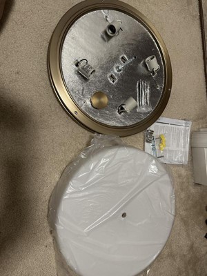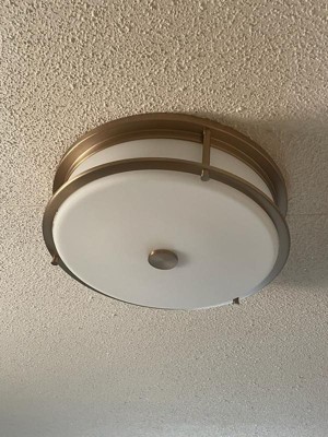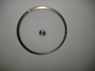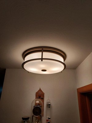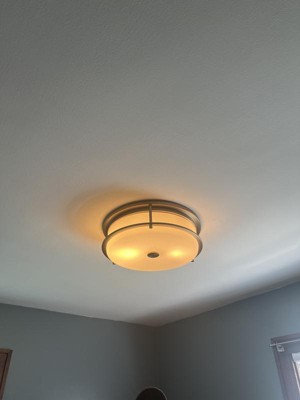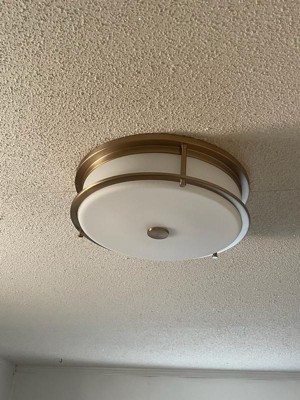 [This review was collected as part of a promotion.] I am very happy to have found this Brit 18 inch 4 light flush mount with Satin Etched Cased light. It is a good size, so gives me plenty of lighting in my hallway where I installed it. I love the brass, and the frosted light, so it isn't too overpowering. It has 4 lights inside, and gives off plenty of light any time of the day or night. Easy to install, and sturdy on the wall, I would recommend.