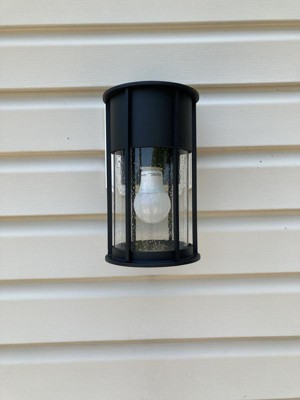 Enhance your home's exterior with the Camillo 11" 1 light wall light. Its vertical louvers and Clear Seeded Glass add refined dimension, while its sleek Black finish maintains its industrial-style edge. Material: Aluminum, Finish Color: Textured/Black, Width: 6", Height: 11", Depth: 7.5", Height From Outlet Box: 3.25", Backplate Width: 4.75", Backplate Length: 6.25", Lamping Type: Incandescent, Number Of Bulbs: 1, Wattage: 100 Watts, Moisture Rating: Wet Rated
