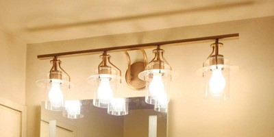 [This review was collected as part of a promotion.] This gorgeous light fixture floods the whole bathroom with light while giving an older bathroom an updated look. The fixture itself is pretty easy to install and comes with everything needed except light bulbs. I like that it takes the regular size light bulbs (A19) since they are more common and easy to find and I normally have some on hand. The bulbs can be to to a 75watt but I installed 4 60watt incandescent bulbs and it's more than enough light. The fixture would look good up or down but I personality prefer the down look since we installed ours closer to the ceiling.