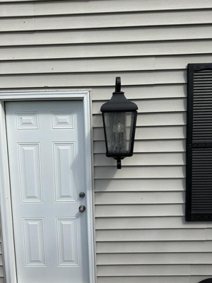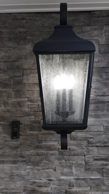 Enhance your curb appeal with the vintage-inspired look of the Forestdale 3-light outdoor wall light. Forestdale's water glass mimics the look of rain cascading down a window and diffuses light in a beautiful vintage glow. Its rich, on-trend textured black finish easily complements various design styles while it's decorative loop arm detail complements updated traditional environments.