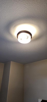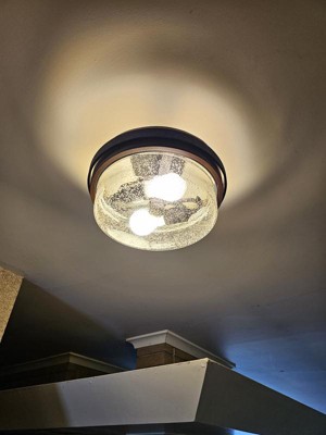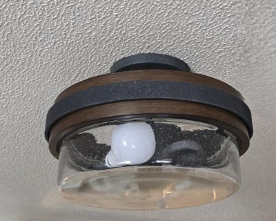[This review was collected as part of a promotion.] I got the Grand Bank 2 light semi flush Mount light drum design in Auburn stained finish. Its so nice in entry way and I like that it has 2 lights. The dome is glass. The size is 7 1/4high and 12in wide. The band looks like wood but isnt. Its a different look and nice in any room.