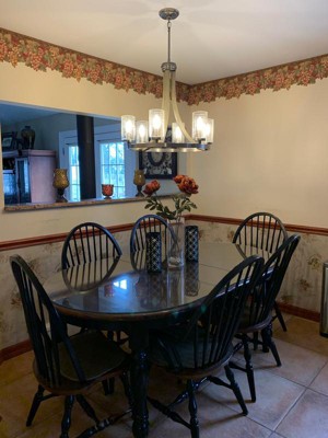 [This review was collected as part of a promotion.] Absolutely LOVE how my Grand Bank 6 Light Chandelier Distressed Antique Gray looks in my kitchen! It didn’t take long putting together it really is a few simple steps. Lining up the arms was simple, the one with the wire didnit allow the screw to line up perfectly the 1st time, but it did after retrying you line it up again. Perfectly, it all lined up. We replaced an exciting light fixture so it was a simple replacement. It does take 2 people this chandelier is pretty heavy. The end result is gorgeous! On the glass, the water drop detailing is such an elegant look it just adds glamour to this beautiful chandelier. The distressed antique gray is beautiful, very soft detailing. We used 1 shorter 6 inch stem for hanging I am in love with my new chandelier.