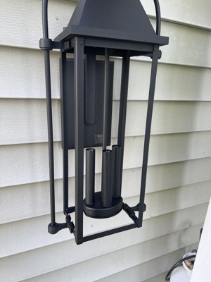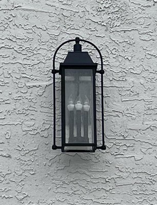 [This review was collected as part of a promotion.] I got the Harbor Row Outdoor Wall Light 3-Light Clear Seeded Glass in Textured Black to put above my garage. I love the carriage style lantern with the loop and seeded glass. It adds a touch of elegance, and contrast to my house. It provided plenty of light with the 60 watt candelabra-base bulbs and is easy to install, and change the light bulbs.