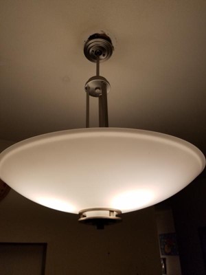 [This review was collected as part of a promotion.] I was so excited to finally receive my Kichler light. As soon as I opened the box, I knew it was high quality just from the packaging. It was packed so carefully with plenty of protection for the glass. At first I was a little scared this would be too large for my Kitchen area, it is on the larger size. The brushed nickel finish is beautiful on this. I have had many brushed nickel products before, but the finish is so smooth to the touch and I was surprised how nice the glass was on this. Usually something of this size would have small air bubbles and the glass is white frosted glass not clear frosted glass. I am remodeling my Kitchen from Country to Modern and this was my first part of the remodel. I did not want to wait to have this in my kitchen, so I decided to hang it myself. The instructions were easy to follow and they give you 4 extenders so you can match perfectly ceiling to floor height. This is hung and it looks more amazing lit. The frosted glass cast such a nice glow, I no longer have to use any of my other 2 lights. Now I will have to look for 2 more Kichler ceiling lights to match.