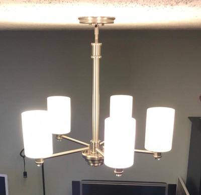 I love this chandelier. It was easy to install, and looks elegant with simple lines. The 5 dimmable light bulbs allow me to adjust the light for a quiet dinner, or a fierce game of scrabble. Wish I had bought this sooner! Just be aware shipping took 2 weeks.