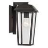 The Mathus small outdoor wall light is equally sturdy and stylish, including thicker glass planes. Fine beveling adorns each pane's perimeter, matching its textured black finish in refined distinction. Material: Aluminum, Finish Color: Olde Bronze, Width: 7.25", Height: 13", Depth: 8.25", Height From Outlet Box: 4.75", Backplate Width: 10.5", Backplate Length: 6.25", Lamping Type: Incandescent, Number Of Bulbs: 1, Wattage: 75 Watts, Moisture Rating: Wet Rated