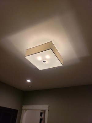[This review was collected as part of a promotion.] Easy to install and looks great in our den. I love the square glass on the bottom so you aren't looking up at the light bulbs. Gives off good light filtered through the fabric.