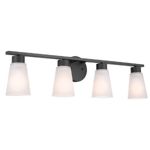 Collection: Stamos, Material: Steel, Finish Color: Black, Height: 8", Length: 31", Depth: 5", Height From Outlet Box: 5.5", Backplate Width: 5", Lamping Type: Incandescent, Number Of Bulbs: 4, Wattage: 60 Watts, Moisture Rating: Damp Rated Material: Steel, Finish Color: Black, Height: 8", Length: 31", Depth: 5", Height From Outlet Box: 5.5", Backplate Width: 5", Lamping Type: Incandescent, Number Of Bulbs: 4, Wattage: 60 Watts, Moisture Rating: Damp Rated