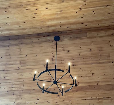 [This review was collected as part of a promotion.] This is a great light. It is large so double check the measurements in your space. I like the take on the traditional wagon wheel. I think breaking the wheel up into sections gives it a modern look. The candle lights on the outside of the wheel is also a modern touch. I am doing a modern country and it is perfect. I think it would also look cool in a gothic style home. I am contemplating getting the brass version for my master. It would look great with my nautical vibe I have going on in that room.