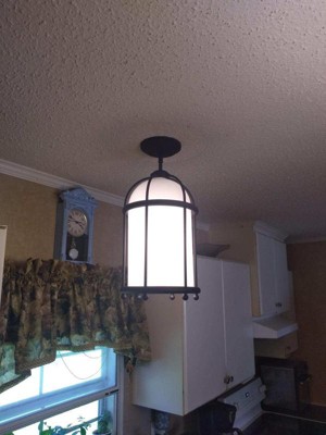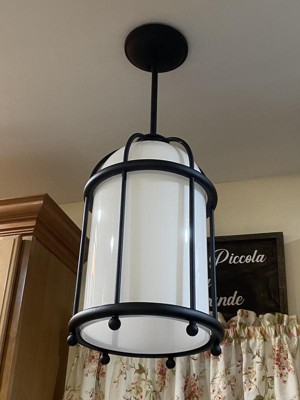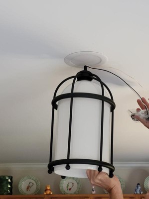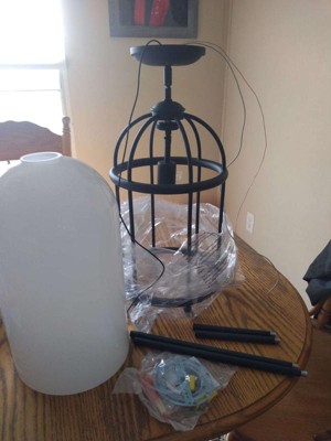 [This review was collected as part of a promotion.] The Topiary 1 light pendant textured black light it so pretty. I really like the decorative cage over the light which gives it such an antique feel. The opal glass is so lovely as well. Very easy to put together and hang. Brings any area to life. I would highly recommend!