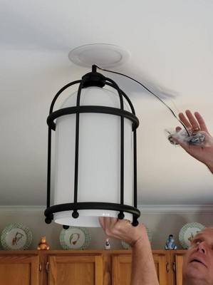 [This review was collected as part of a promotion.] The topiary light is a versatile light it comes with rods you can adjust for any height and the movable shaft enables you to hang it anywhere you like. The outside looks old fashioned with its black iron but the white glass on the inside gives it that special something that sets it apart. We chose to hang it in our kitchen and are really happy with the way it looks. The installation was average to easy. It is plenty bright without being overwhelming.