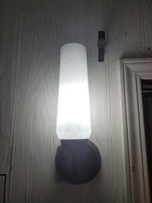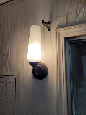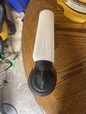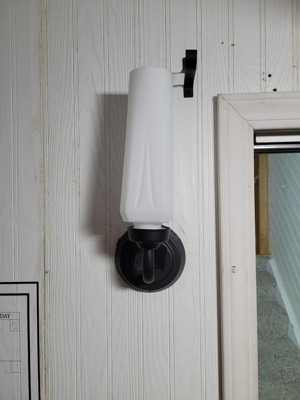 [This review was collected as part of a promotion.] We changed out a light fixture and replaced it with this one. I like the black on the metal and then the frosted glass that covers the light. You could either mount it up or down and we went with the upwards position and it looks great. It reminds me of a candle. It just goes so well with everything else. It was easy to install and came with all the needed items, took my husband about 10 minutes to install. The original bulb it came with was more of a yellow and with this being installed in my office I needed a bright white, I went online and purchased a new bulb and replaced it with the one I wanted and now its bright enough for me to see my work.