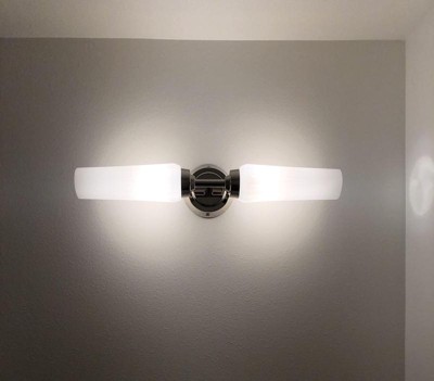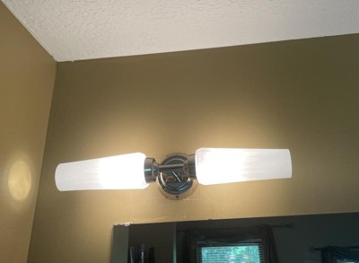[This review was collected as part of a promotion.] Gorgeous lighting and easy to install. I love the look and the quality of this vanity light. It is encased in two oblong globes that let off the perfect amount of light for my guest bathroom. The style is just lovely and although it is simple the way the light glows through off an elegant flair.