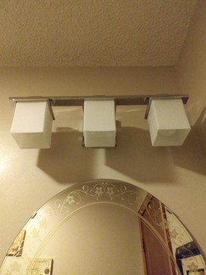 [This review was collected as part of a promotion.] Between removing the old fixture and me deciding which way I wanted the cubes to hang, took longer than the actual installation. Easy to read instructions with illustration are included, light bulbs are not. I really like the design of the chrome bar fixture itself very sleek and modern looking. The flawless glass globes are cube shaped and look frosted in color. I love being given the choice upon installation of which way to hang the globes facing either upward or downward. After my husband removed the old fixture I had him hold this one in place both ways while I decided and ultimately went with globes facing downward. I also like the fact that the light does not require any speciality type of light bulb.