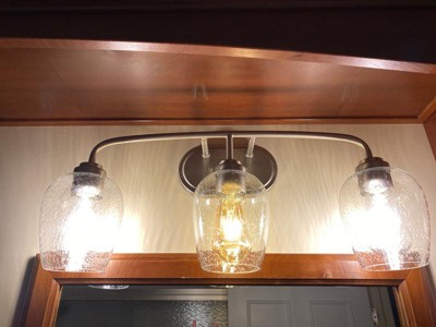 [This review was collected as part of a promotion.] Ever since we moved into our house I felt like I needed to swap out our guest bathroom light above the sink. The issue? It’s encased in some Amish built monstrosity... which, whatever. I like wood I guess but the only lights that would work for our awkward space have to be able to be mounted pointing downward, or in most cases, upside down. Not all lights are able to be mounted that way so after I found this light (and fell in love with it) I was hoping that it was manly enough to grasp those beautiful globes while suspended in midair. The light came packaged quite well, which is a good thing because those beautiful globe thingies are quite fragile... but! They are gorgeous. I love the bubble glass and I especially love how they look with our Edison bulbs. We tried out amber hued ones as well (see pics) but they weren’t bright enough in contrast to the massive amount of wood that’s in our bathroom. Installation by my personal electrician (aka, the husband guy) was fast and easy- and painless because he didn’t hulk out and break anything in the process. I love this light. It brightened up my bathroom and makes me smile every time I see it!