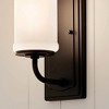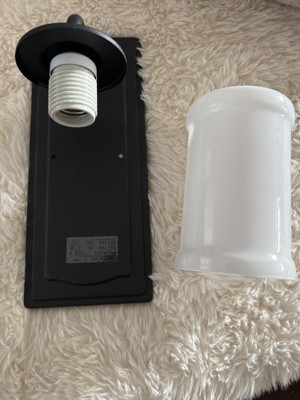 Collection: Vetivene, Material: Steel, Finish Color: Textured Black, Width: 6.25", Height: 12", Length: 5", Depth: 6.25", Height From Outlet Box: 6", Backplate Width: 5", Backplate Length: 1", Lamping Type: Incandescent, Number Of Bulbs: 1, Wattage: 75 Watts, Moisture Rating: Damp Rated, Desc: Warm and inviting, the Opal Glass of Vetivene's 1 light wall sconce glows against a refined Textured Black background. It easily accents your cottagecore style throughout your home. Embracing the warmth and comfort of vintage style, Vetivene is refreshing and versatile A rich Black finish with a subtle surface texture that creates dimension as it effortlessly complements various design styles Opal Glass shades mimic Depression-era milk glass to illuminate in nostalgic beauty Fixture measures 12.0-in height x 5.0-in width x 6.1-in extended Add a touch of vintage to your bathroom vanity or use as a stylish, ambient accent throughout your interior Takes one medium A19 up to 75W bulb or equ