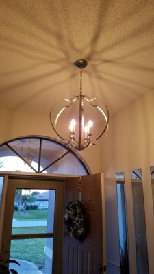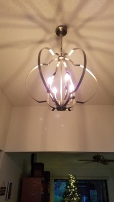 Designed with an intertwined spherical shape and geometrical details, the Voleta(TM) 4-light large foyer pendant with Black finish makes a great statement piece, adding visual interest to any room. Chain Length: 72.00 Material: Steel, Finish Color: Brushed Nickel, Width: 22", Height: 26.25", Chain Length: 72", Lamping Type: Incandescent, Number Of Bulbs: 4, Wattage: 60 Watts, Dimmable: No, Moisture Rating: Dry Rated