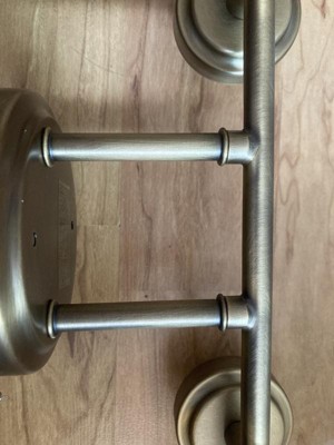 [This review was collected as part of a promotion.] This 4-light vanity fixture is of good solid quality. The glass over the lights has cute little bubbles in it and they reflect the light from the bulbs nicely. The metal is an old time brass color, without the shine. Nice light fixture that is easy to install.