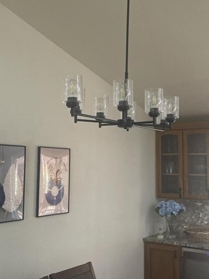 The modern Winslow 8 light chandelier in a Black finish with Clear Seeded glass shade pair beautifully with the linear arms, bringing light and dimension to a space. Material: Steel, Finish Color: Black, Width: 20", Height: 14.75", Length: 44.25", Lamping Type: Incandescent, Number Of Bulbs: 8, Wattage: 75 Watts, Dimmable: No, Moisture Rating: Dry Rated