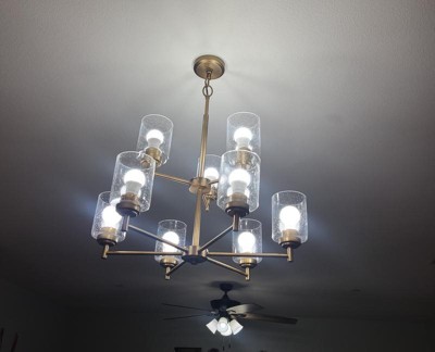 [This review was collected as part of a promotion.] These chandelier is what we need for our new home. This is so beautiful and elegant. I loved its design and color combination. My husband was able to install it in about 30 minutes. This was easy to assemble and instructions were easy to understand. You will need 9 bulbs for this and your house will shine bright and this will make it look classy.