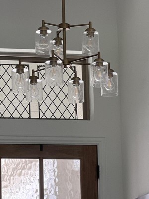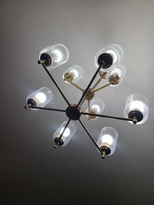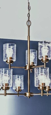 The modern Winslow 9-light chandelier in a Black finish with Clear Seeded glass shade pair beautifully with the linear arms, bringing light and dimension to a space. Chain Length: 36.00 Material: Steel, Finish Color: Natural Brass, Width: 27", Height: 27", Chain Length: 36", Lamping Type: Incandescent, Number Of Bulbs: 9, Wattage: 75 Watts, Dimmable: No, Moisture Rating: Dry Rated